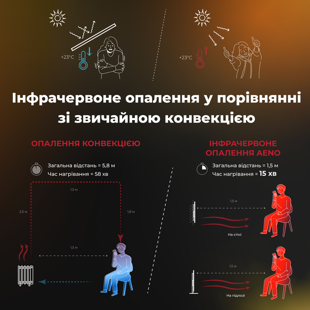 ![]() | Ефективніше за інші види опаленняЕнергозберігаюча інфрачервона та конвекційна технологія робить обігрівач AENO економічно вигіднішим, ніж більшість традиційних систем опалення, таких як кондиціонери, газові обігрівачі, центральне опалення, тепла підлога. |