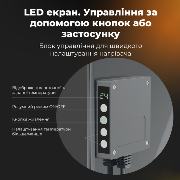 Встановіть і підтримуйте комфортну температуру для економії енергіїОбігрівач споживає лише 160 Вт порівняно з 700+ Вт при 120°C. Це допомагає уникнути перегріву та втрати енергії. Коли ви встановлюєте температуру панелі обігрівача на 60°C, вона виробляє 160 Вт на годину, чого достатньо для підтримки комфортної температури в кімнаті. | ![]() |