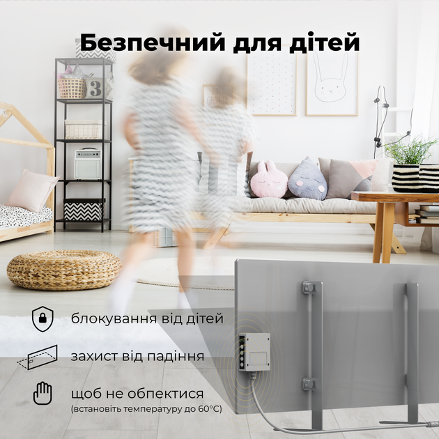 ![]() | Безпечний для дітей і тваринЯкщо обігрівач падає, він автоматично вимикається, подає звуковий сигнал та надсилає сповіщення на смартфон.
