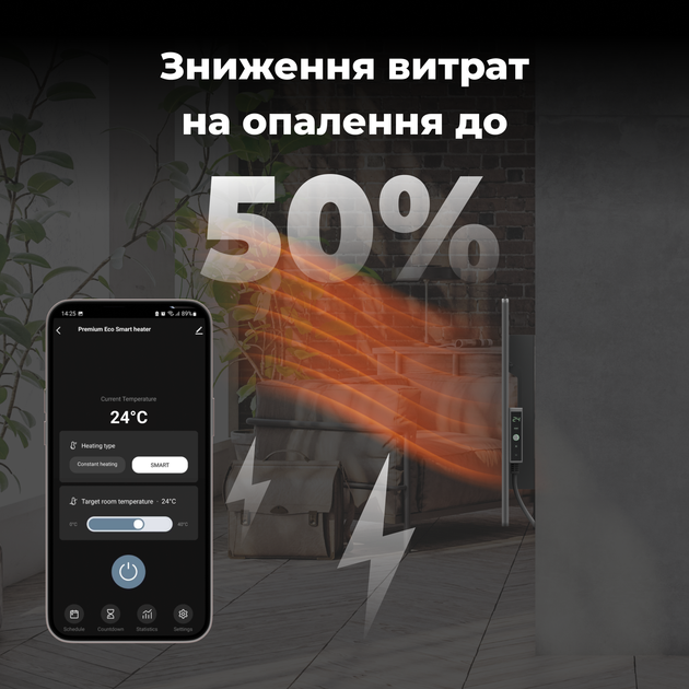Зниження витрат на опалення до 50%Обігрівач AENO ефективно використовує потужність 700 Вт, не витрачаючи зайві гроші та тепло. Економія енергії та коштів до 50% за весь опалювальний сезон. | ![]() |